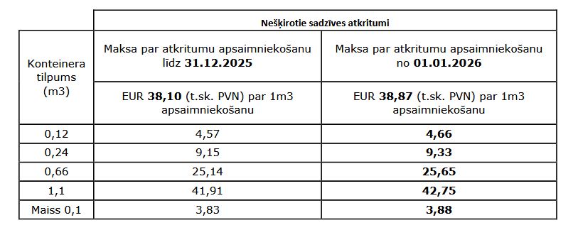 Par sadzīves atkritumu apsaimniekošanas maksas izmaiņām no 2026. gada 1. janvāra.